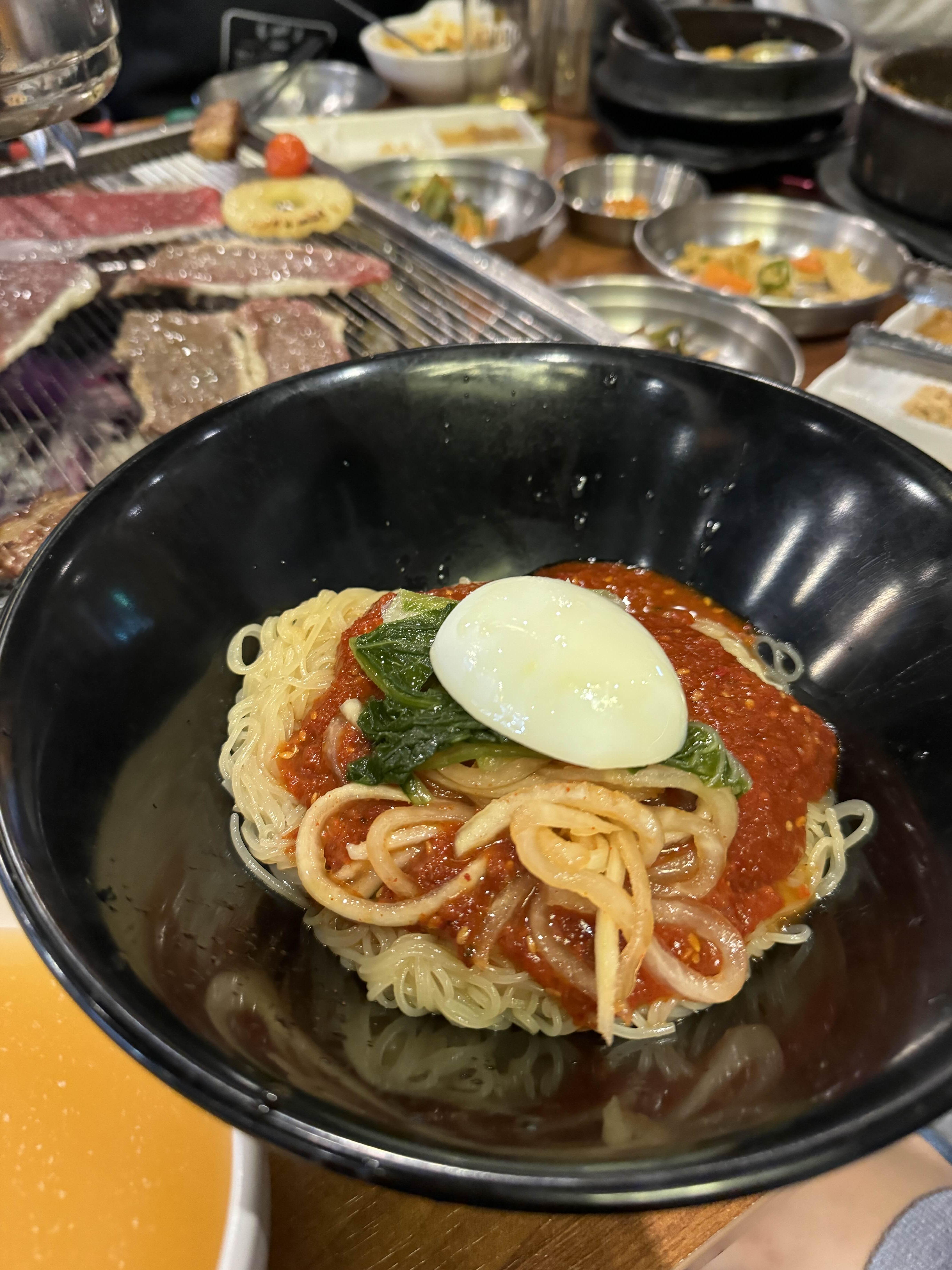 비빔국수의 매콤함과 차돌박이의 기름짐이