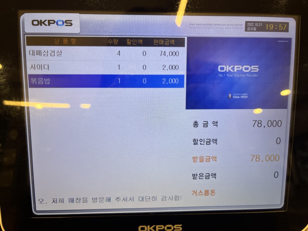 우리 4명은 배가 터졌지만, 대패삼겹살 3인분을 더 먹어 치웠죠.