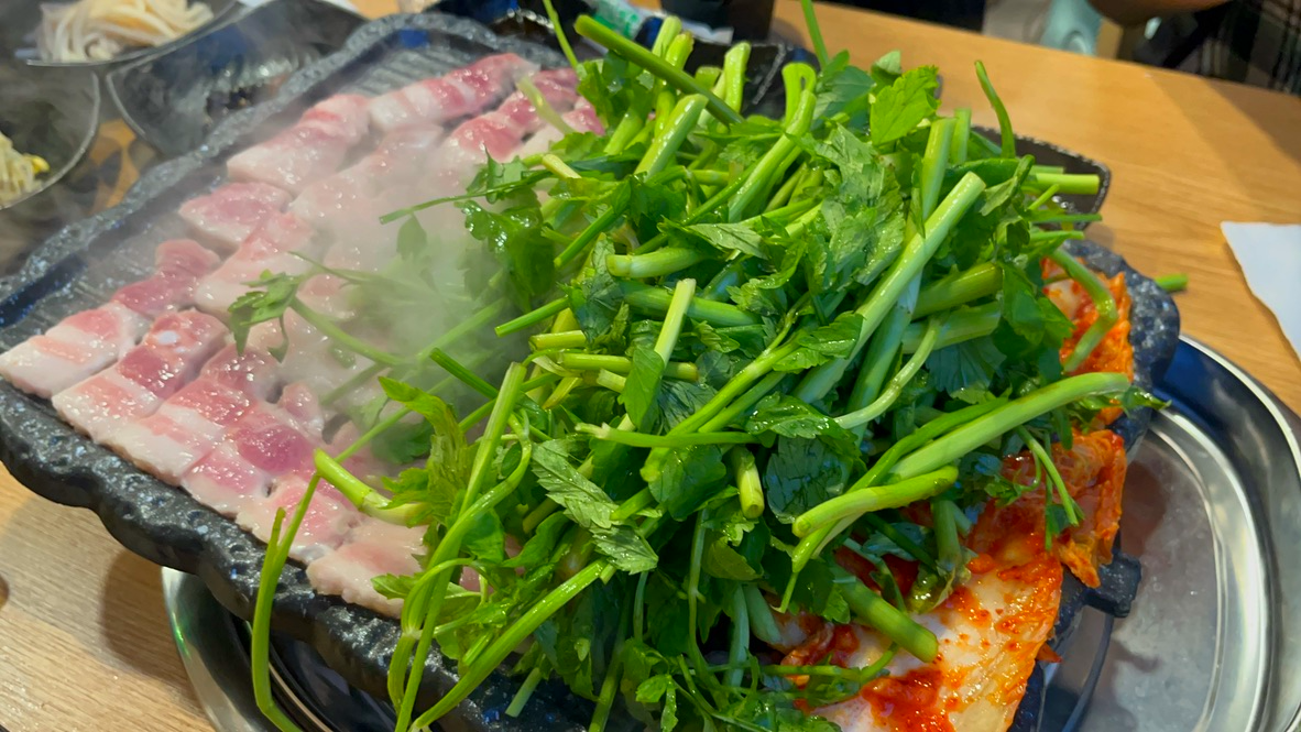 김치랑 삼겹살이랑 미나리 같이 싸먹으면, 진짜 꿀맛이잖아요.