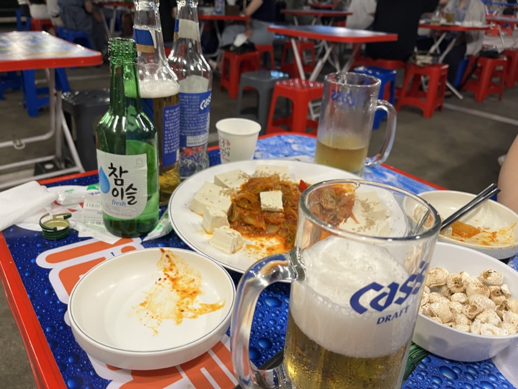 오늘은 이것저것 잔뜩 먹고 왔기 때문에 두부김치와 생맥주 2잔 주문했어요.