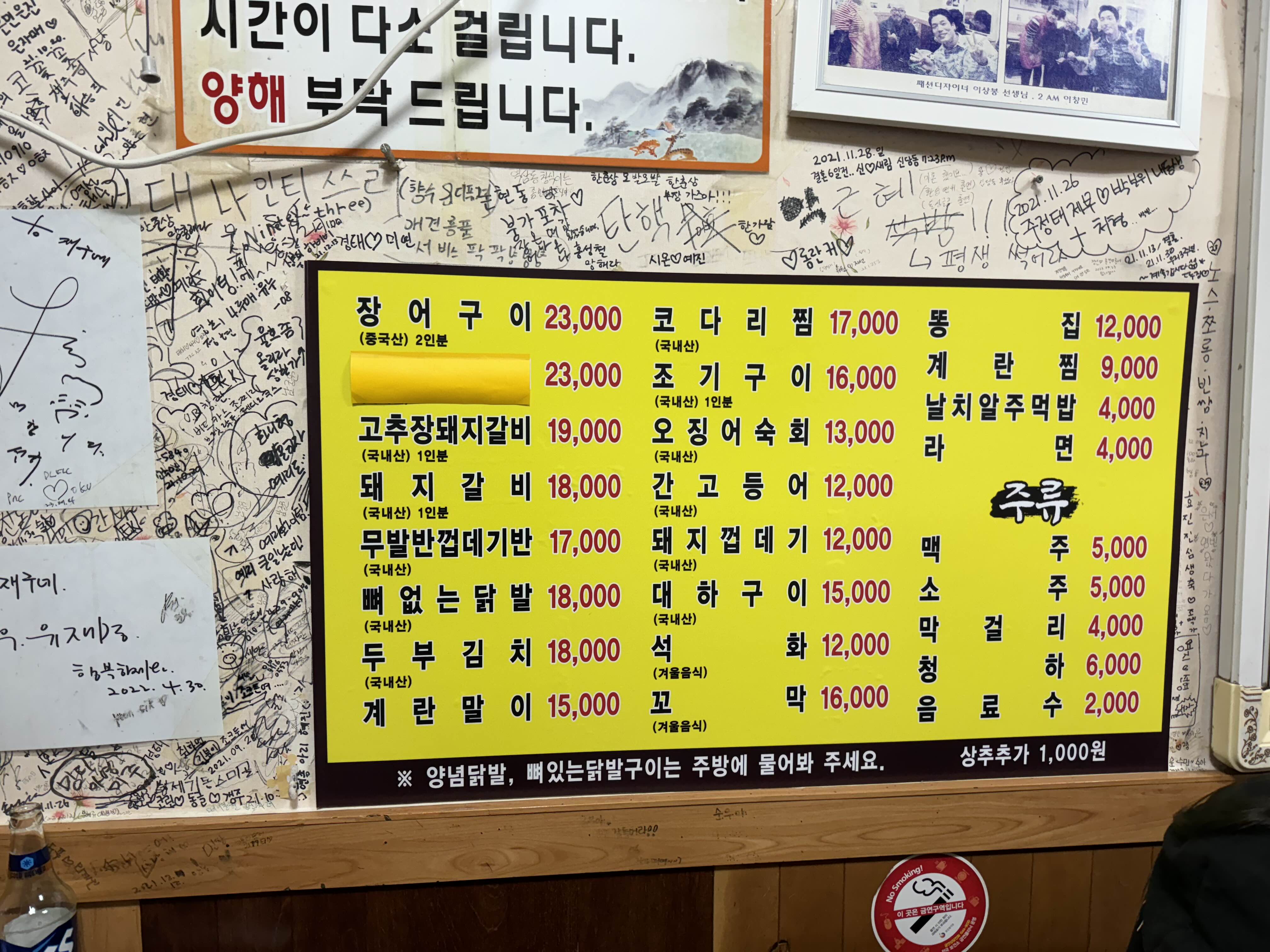 뼈있는닭발구이는 주방에 물어봐야 주문할 수 있다고 해요.