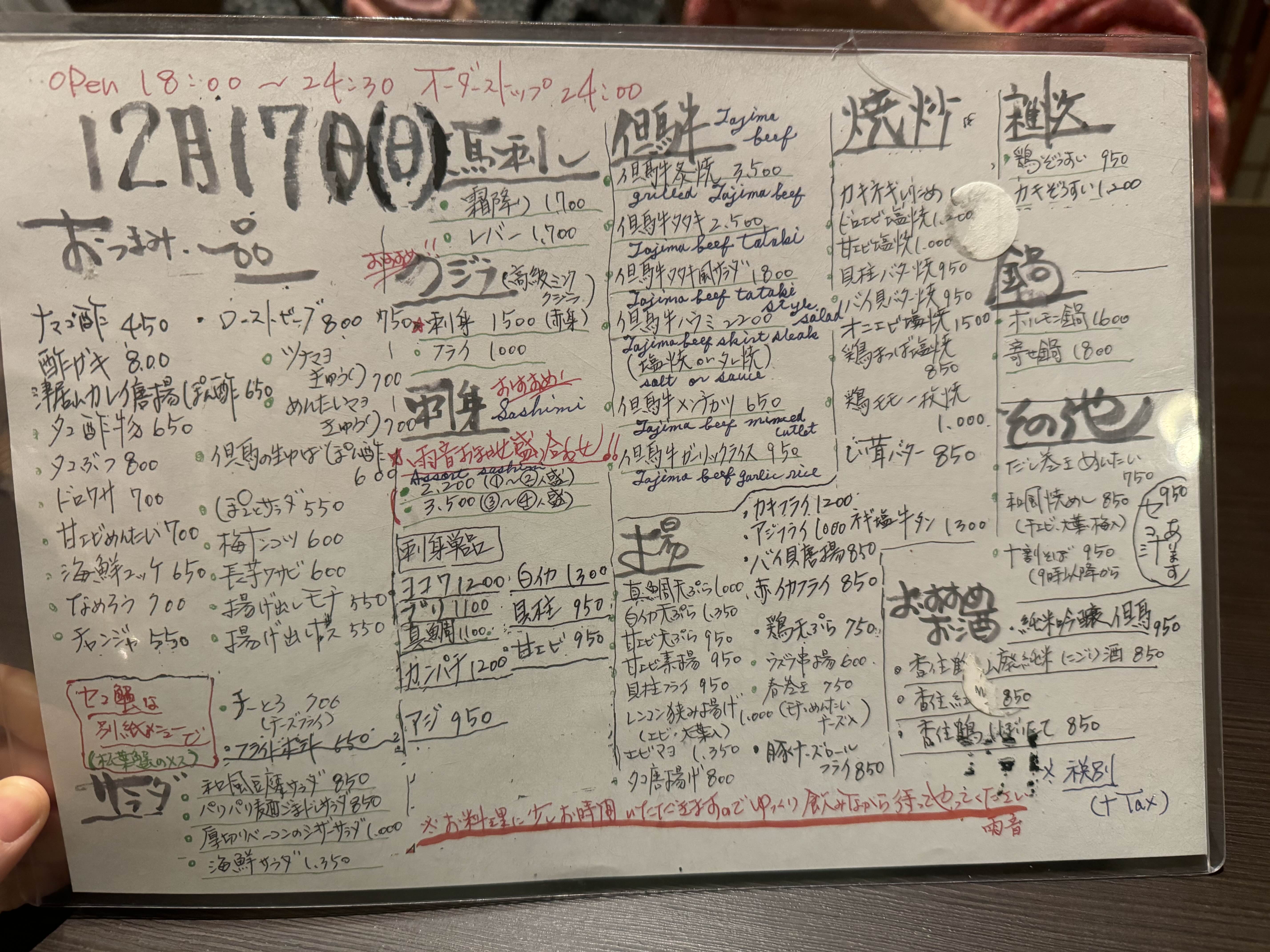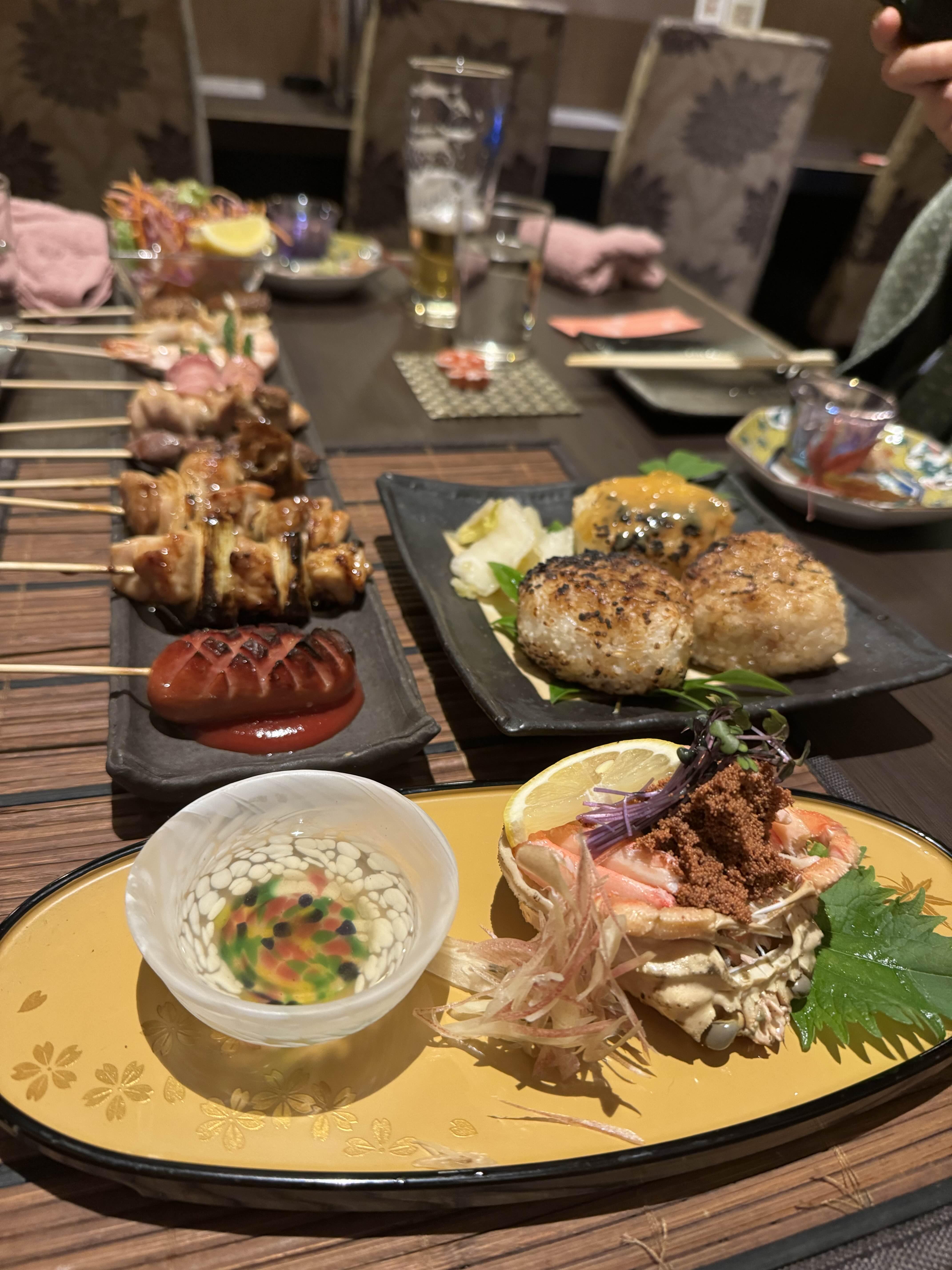 두번째 온천까지 즐기고 배가 고파져 저녁을 먹으러 왔다. 원래 근처 대게집에서 게를 구워먹고 싶었는데, 그 메뉴는 하루 전에 예약을 해야한다고해서 먹을 수 없었다. 결국 돌아다니다 꼬치집으로 들어오게 되었다.