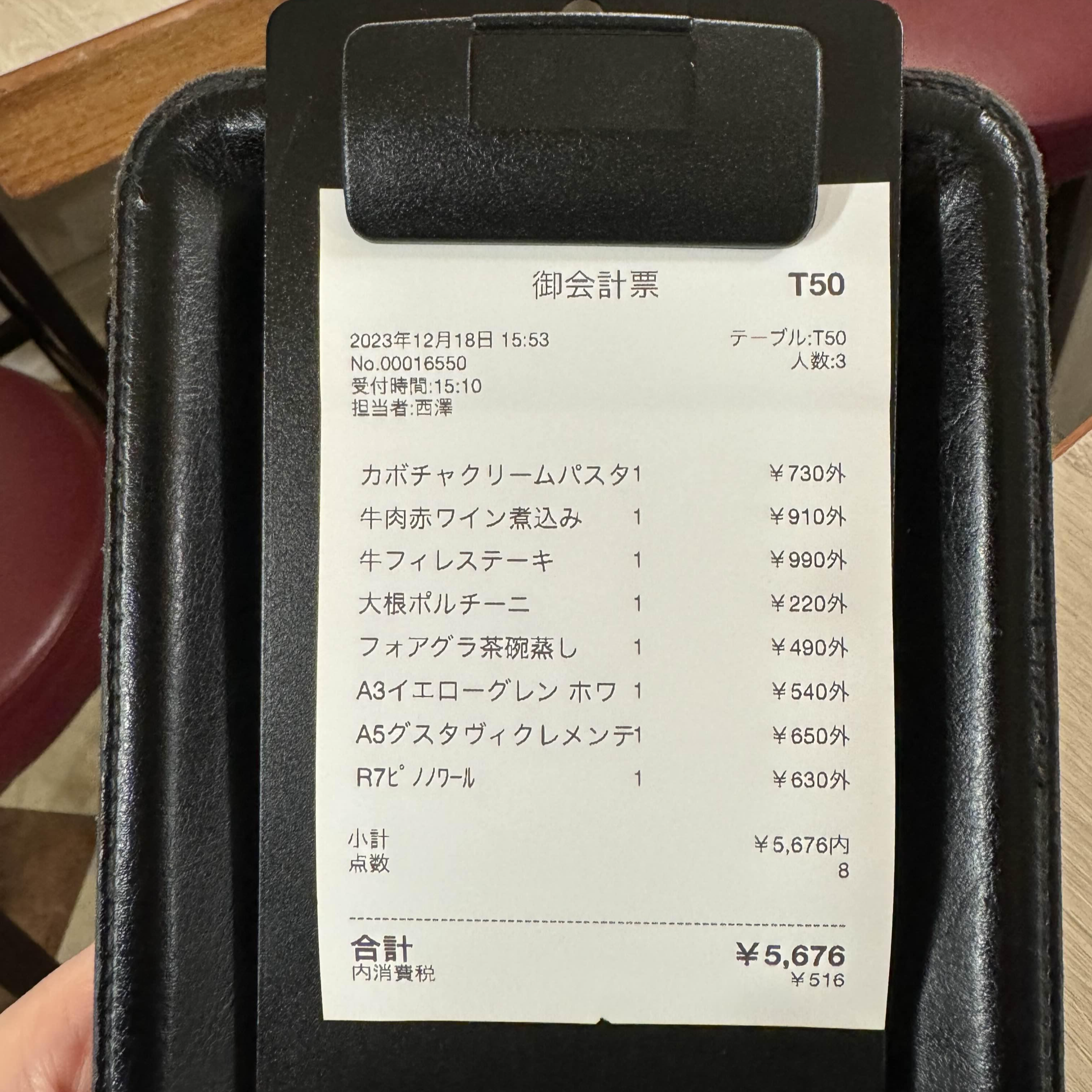 와인과 함께 몇가지 음식을 즐겼는데 3명이서 총 5,676엔밖에 안나왔다. 음식은 맛있었는데 아무래도 주문을 잘못한거같다. 다음에 방문한다면 스테이크를 제대로 다시 주문해볼 생각이다. 파스타도 맛있고 푸아그라 계란찜은 부드러우면서 신기했다. 무조림은 특별할거없이 그냥 무조림이었는데 너무 부드러워서 놀라웠다. 프렌치 일식을 즐기고 싶은 분들이라면 꼭 방문해보시길 추천드린다.