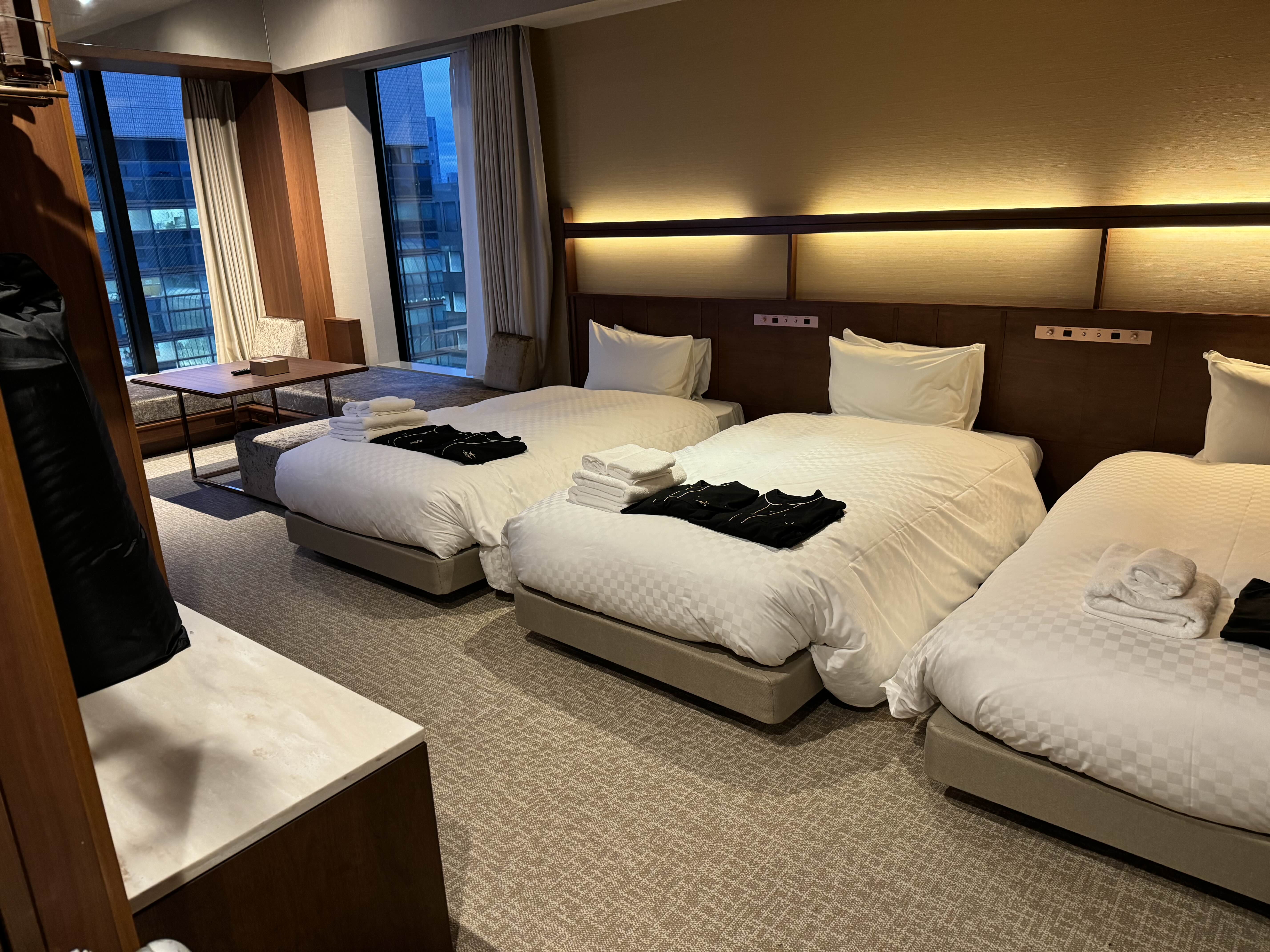 3명인데 5명으로 모든 어메니티와 잠옷 등을 챙겨준 것이 재밌었다. 신축 호텔이라 그런가 신입들이 체크인 인원수 확인 안하고 최대 인원수로 세팅해놓은 것 같아 귀여웠다. 4박은 칸데오에서 보내고, 나머지 일정은 오사카 시청과 강 전망의 기타하마 역 근처 숙소로 이동하기로 했다.